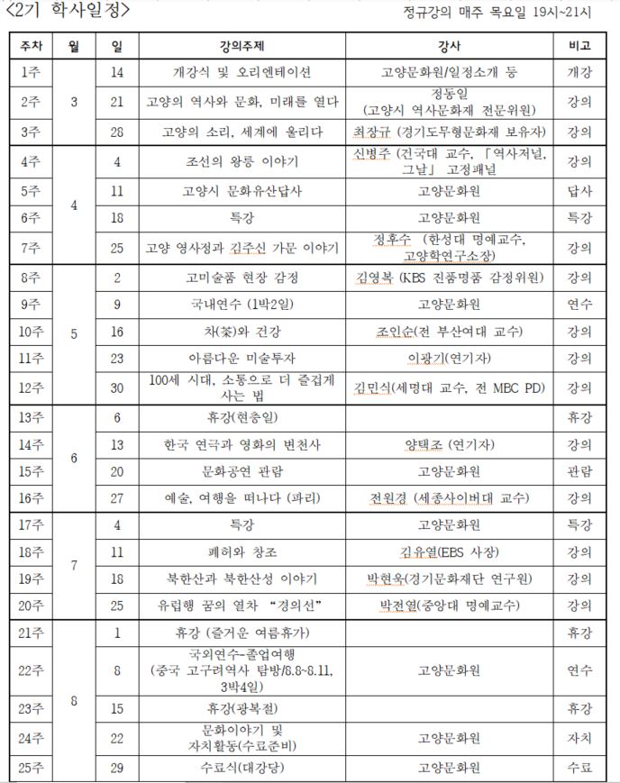 주요 커리큘럼은 인문학 강연 13개 과정, 유명 인사 특강 2개 과정, 고양시 답사 및 국·내외 연수 등 연수·견학이 5개 과정, 기타 행사 등이 6회로 이루어져 있다. 주요 강사진은 고양시의 역사와 문화 부문에 정동일 전문위원과 최장규 경기도 무형문화재보유자, 『역사저널, 그날』의 저자 신병주 건국대 교수, 전 MBC PD 김민식 교수, EBS의 김유열 사장, 연기자 양택조·이광기, 전원경 세종사이버대학교 교수 등 고양시와 우리나라를 대표하는 유명강사들이다.