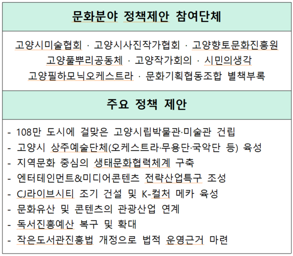 문화분야에서는 고양에서 활동하는 문화예술인과 관련단체 대표 등 9명이 정책제안에 동참했고, 고양풀뿌리공동체 이춘열 정책위원이 종합발표를 맡았다.