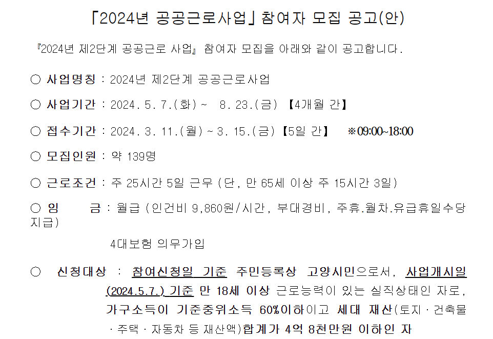 공공근로 사업은 △참여신청일 기준 주민등록상 고양시민 △사업개시일 기준 만 18세 이상 근로능력이 있는 실직상태인 자 △가구소득 기준중위소득 60% 이하 △가구 재산합계 4억8000만원 이하 등을 만족해야 신청할 수 있다.