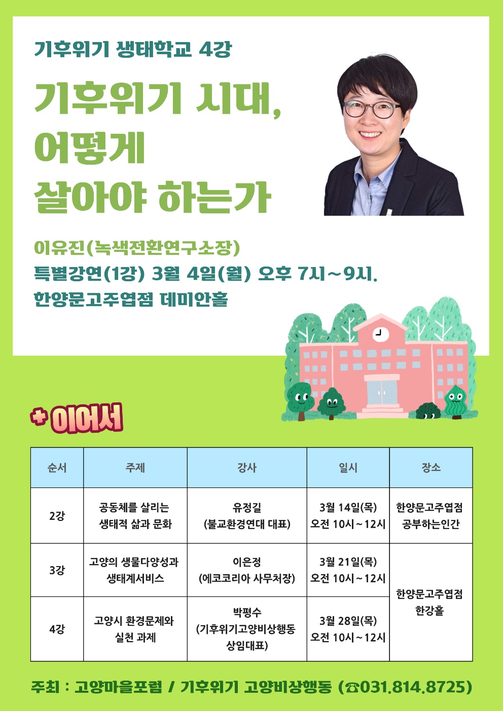 기후위기 생태학교 강좌는 이유진 녹색전환연구소장 강의를 포함해 총 4회 진행되며 △14일 유정길 불교환경연대 대표 ‘공동체를 살리는 생태적 삶과 문화’ △21일 이은정 에코코리아 사무처장 ‘고양의 생물다양성과 생태계서비스 △28일 박평수 기후위기고양비상행동 상임대표 ‘고양시 환경문제와 실천 과제’가 이어진다.