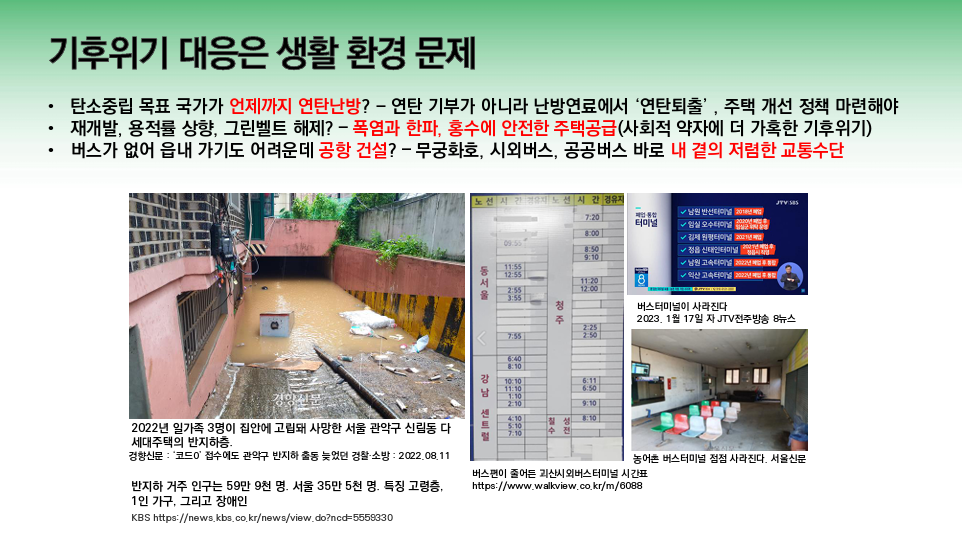 이번 총선에 출마하는 국회의원들은 기후위기가 지역 주민들의 생계와 경제에 미치는 영향을 생각해 공약을 내야 한다. 폭염 위험도가 높은 지역 대구 달서구·북구·수성구, 전북 전주시, 충북 청주시 등에는 폭염에 대한 지역 주민 안전대책과 관련한 공약을, 폭우 위험이 높은 경남 남해군·거제시, 경북 경주시, 제주 서귀포시 등에는 폭우에 대한 안전망과 관련한 공약이 필요하다. 겨울에 연탄 배달 봉사보다 이용이 불편하고 많은 폐기물이 발생하는 연탄을 연료로 써야 하는 가구의 주거 상황과 폭우를 걱정하는 반지하 거주자에 대한 논의도 필요하다. 연탄을 쓰지 않도록, 여름에도 적정한 주거의 질을 보장할 수 있도록 안정화하는 것이 핵심이다.