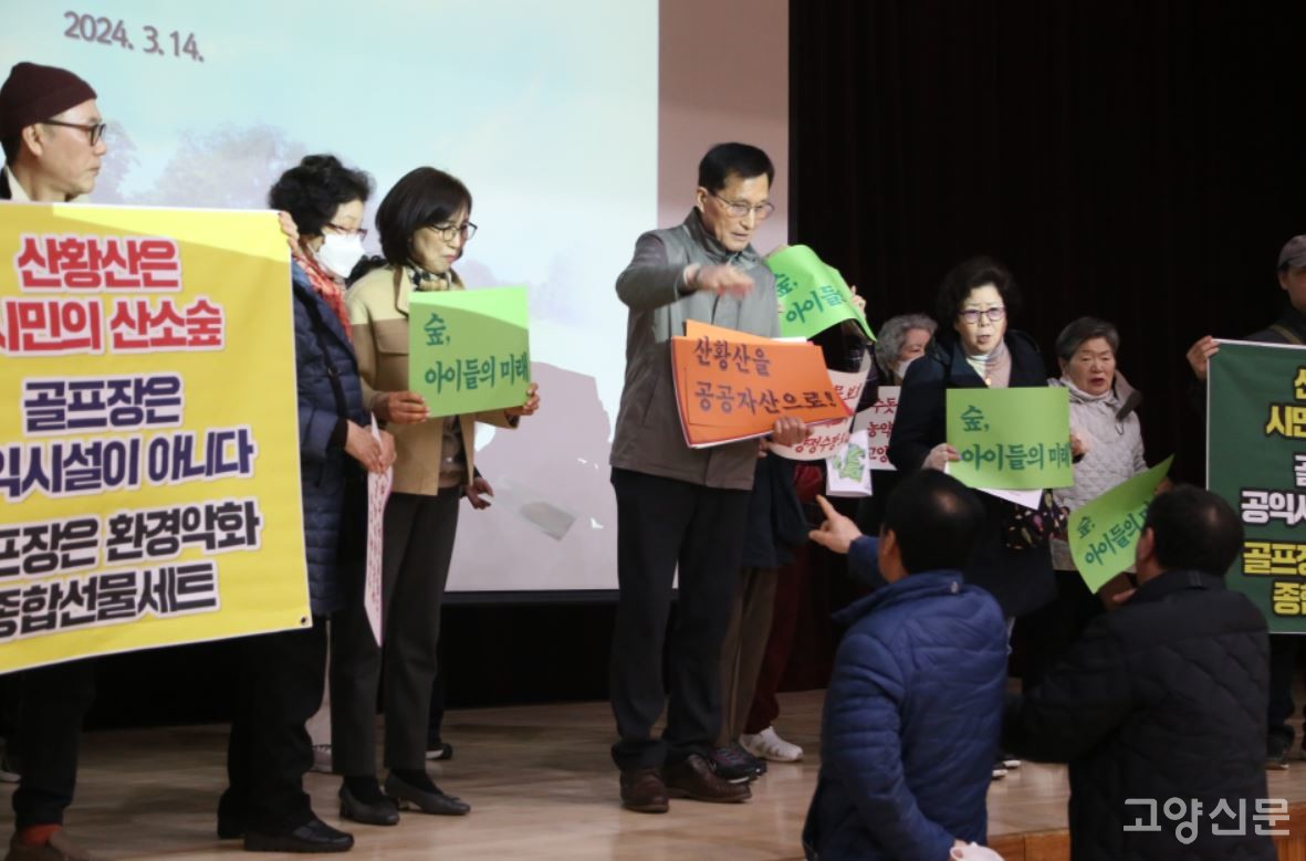 지난 14일 일산동구청 대강당에서 열린 ‘스프링힐스 CC 골프장 증설사업 환경영향평가 재협의(초안) 주민설명회’는 사업자 측의 설명을 저지한 주민들에 의해 무산됐다. 사업자 측이 주민설명회를 하려고 하자 윤판중 풍동 중앙하이츠빌 입주자 대표 등 산황동 주민 20여 명은 연단에 올라 설명회를 저지했다. 이들은 일찌감치 일산동구청 대강당에 모여 ‘산황산은 시민의 숲’ 등이 쓰여진 피켓을 들고 시위를 준비하고 있었다.