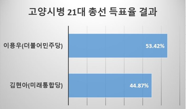 [고양신문] 2012년을 기점으로 고양시정 선거구는 민주당 지지세가 우위에 있는 지역으로 알려져 있다. 2004년 17대, 2008년 18대 총선에서는 한나라당의 김영선 후보가, 2012년 19대, 2016년 20대에서는 민주당의 김현미 후보가 당선된 곳이다. 2020년 21대 선거에서도 이용우 후보가 당선되며 12년을 민주당이 장기 수성한 곳이기도 하다. 4년 전 선거에서는 53.42%를 득표한 더불어민주당 이용우가 44.87%를 득표한 미래통합당 김현아 후보에 8.55%p 앞섰다. 그러나 GTX A선의 수혜를 주로 입는 킨텍스한류월드지구 아파트의 입주, 그리고 창릉신도시 개발에 대한 반감 등으로 보수세가 조금씩 더해지고 있다.