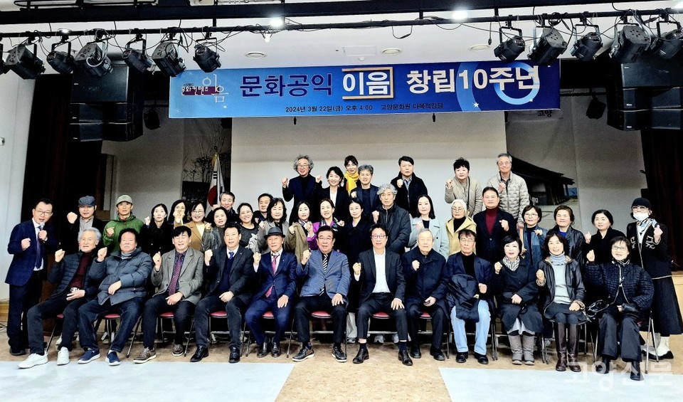 이음 창단 10주년을 기념하는 행사가 지난 22일 고양문화원 다목적 강당에서 열렸다. 김재덕 대표(전 고양미협회장)의 인사로 시작된 이날 행사는 박승범 고양시 원로작가회장을 비롯해 고양에 거주하는 많은 예술인과 문화단체 대표, 관계자들이 대거 참석한 가운데 성황리에 진행됐다.