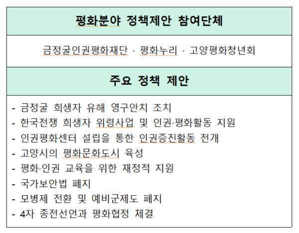 평화분야에서는 금정굴인권평화재단과 고양평화청년회, 평화누리 3개 단체가 한반도의 평화를 앞당기고, 평화도시 고양으로 나아가기 위한 정책을 제안했다.