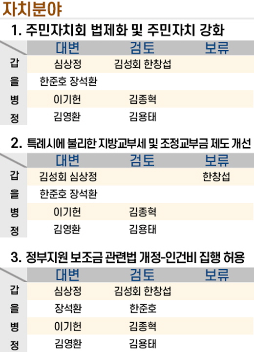 고양시민사회 정책제안서는 11개 분야 30가지의 제안으로 요약됩니다. 자치분야에는 주민자치를 강화할 수 있는 주민자치회 법제화와 고양시와 같은 대도시에 불리한 재정조정제도를 개선할 수 있는 지방교부세 제도개선이 포함돼 있습니다. 또 시민참여와 민간단체 활성화, 민간협업을 강화하기 위해 추진되고 있는 정부보조금 사업이 오히려 민간단체의 발목을 잡고 있는 현실을 개선하기 위한 정부보조금 관련법 개정문제도 언급됐습니다. 민간단체 보조금 사업집행 시 인건비 집행이 가능하도록 인건비 사용제한 규제를 개선하는 내용입니다.