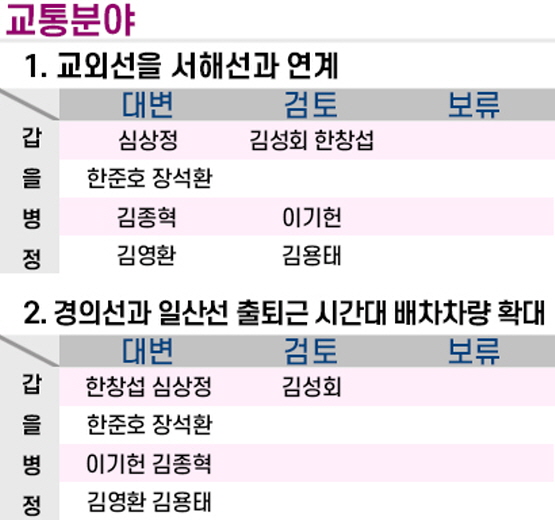 교통분야에서는 교통여건이 열악한 고양과 경기북부지역을 연계하는 광역철도계획으로 서해선과 교외선을 연결하는 방안이 제안됐고, 경의선 일산선 출퇴근 시간대 배차 차량 확대요구도 있었습니다. 경제분야에서는 지역 공공기관 발주사업이나 지역개발사업을 할 때 지역기업과 우선 계약할 수 있는 제도를 만들고, 이 제도의 혜택을 받은 기업의 이익을 지역사회에 환원하거나 지역금융기관의 수익을 지역 내 저소득 가구 신용대출에 투자하도록 의무화하는 등 지역순환경제를 활성화 할 수 있는 근거법으로 지역재투자법을 제정하자는 제안이 있었습니다. 고양시경제자유구역 지정 지원, 고양바이오클러스터 조성 등 고양의 현안과 관련한 제안과 소상공인 금융지원 확대, 지역화폐 발행 확대 등이 포함돼 있습니다.