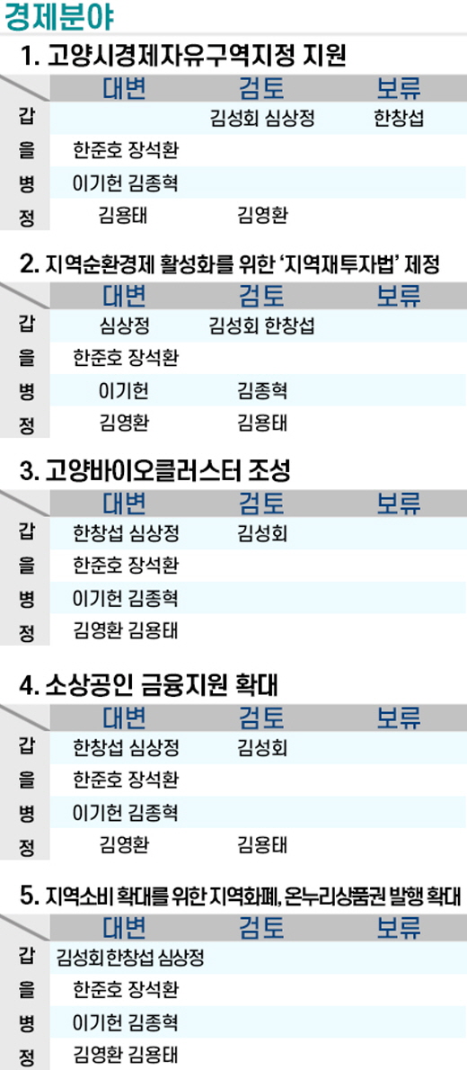 정책제안의 내용은 참여한 100여개 단체와 관계자들에게 모두 동의를 받은 것은 아닙니다. 때문에 참여한 단체들도 다른 의견을 가질 수 있습니다. 후보자들 역시 정당의 정책과 개인의 소신을 반영해 자유롭게 입장을 정리했습니다. 정책제안 과정에 애쓰신 제안자들과 제안서를 정리하는 데 정성을 들인 고양포럼 관계자들께 감사드리며, 선거에 도움이 되길 바라는 마음을 담아 보도합니다.