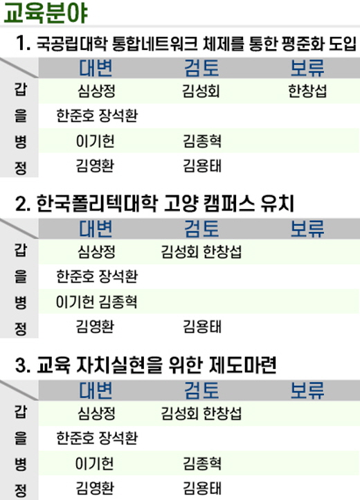 교육분야에서는 한국폴리텍대학 고양캠퍼스 유치 등 누구나 공감할 만한 제안도 있었고, 국공립대학 통합네트워크 체제구축을 통한 대학평준화, 교육자치 실현을 위한 제도마련 등 교육민주화와 관련된 제안이 있었습니다.