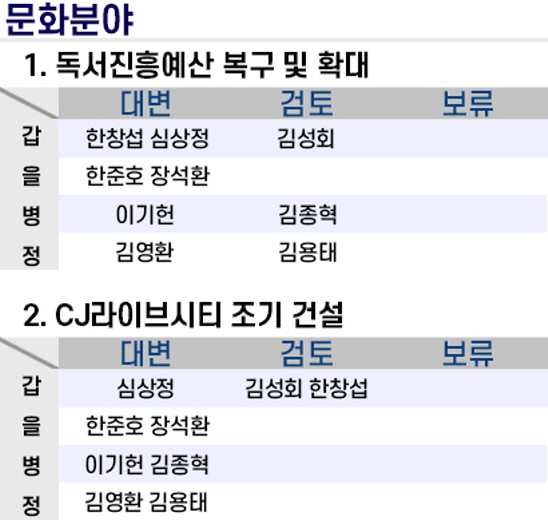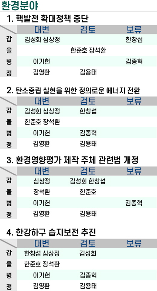 문화분야에는 고양의 최대 이슈인 CJ라이브시티가 당초 계획대로 추진될 수 있도록 지원해야 한다는 제안, 대폭 삭감된 독서진흥예산을 복구하고 확대해야 한다는 제안이 같이 들어 있습니다. 환경분야에서는 각 정당의 입장이 대립될 만한 주제가 제안됐습니다. 핵발전 확대정책 중단과 탄소중립 실현을 위한 정의로운 에너지 전환, 환경영향 평가의 주체가 사업자가 아니라 지자체와 시민단체가 되어야 한다는 내용입니다. 람사르습지인 장항습지를 품고 있는 한강하구 일대를 보전하고 개발압력에 밀리지 않도록 해야 한다는 제안도 들어 있습니다.