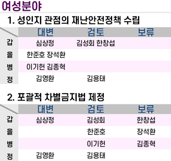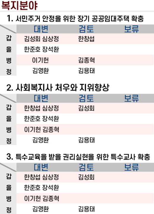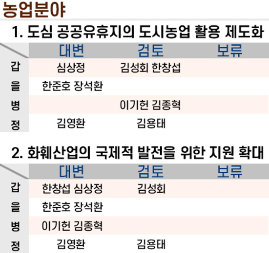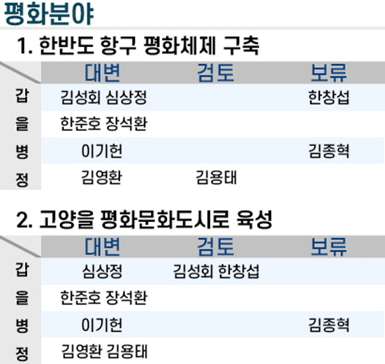 평화분야도 정당별 입장이 다를 수 있는 주제가 담겼습니다. 한반도 항구 평화체제 구축, 평화문화도시 고양을 위한 정책입안 등입니다. 농업분야에서는 도심유휴지 활용제도화, 글로벌 화훼산업을 위한 육종산업 육성 등이 제안됐고, 여성분야에서는 성인지관점의 재난안전정책 수립, 각계의 반응이 예민한 포괄적 차별금지법 개정 등이 포함됐습니다. 복지분야에는 서민주거안정을 위한 장기 공공임대주택 확충, 사회복지사 처우와 지위 향상, 특수교사 확충 등이 제안됐습니다.