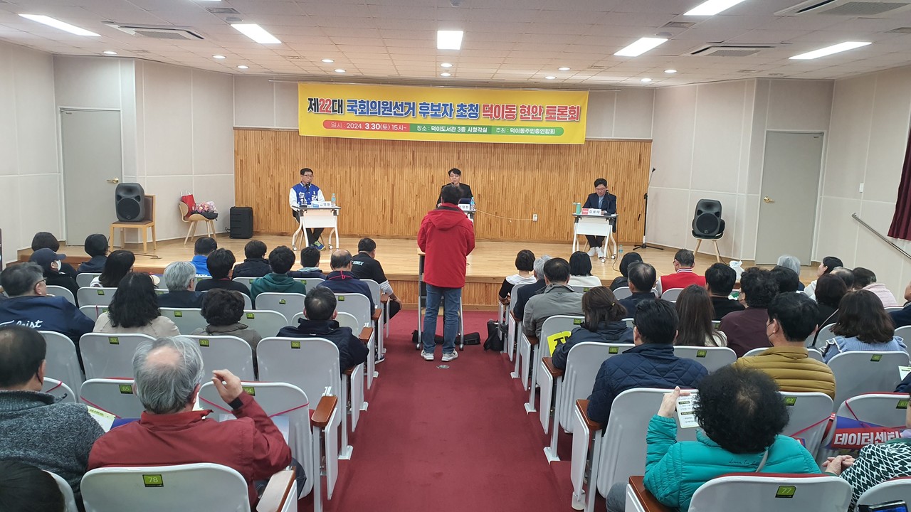 [고양신문] 덕이동주민총연합회(회장 오정한)가 ‘제22대 국회의원 선거 후보자초청 덕이동 현안 토론회’를 지난 31일 덕이도서관에서 개최했다. 이날 토론회에는 고양시정 선거구에 나선 더불어민주당 김영환 후보와 국민의힘 김용태 후보가 토론자로 참석해 정책과 의견을 덕이동 주민들 앞에서 밝혔다. 이날 토론회는 덕이동주민총연합회 회원들과 덕이동주민자치회(회장 이라희솜) 회원, 그리고 하이파트시티 입주민을 비롯한 덕이동 주민 등 150여 명이 참여한 가운데 오정한 덕이동주민총연합회장의 사회로 열렸다.
