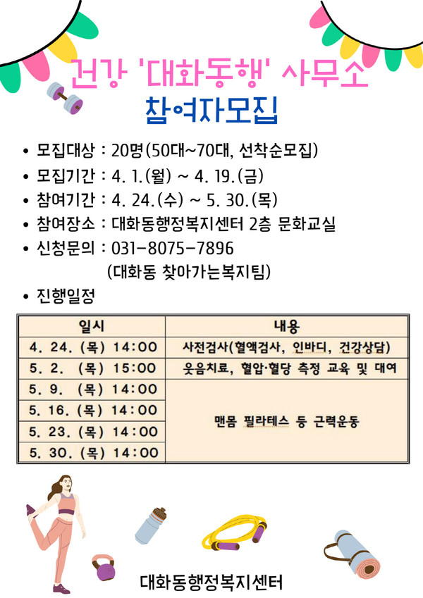 [고양신문] 대화동이 주민들의 맞춤형 건강관리를 위해 추진하는 ‘건강 대화동행 사무소’ 참여자 20명을 4월 19일까지 선착순으로 모집한다.