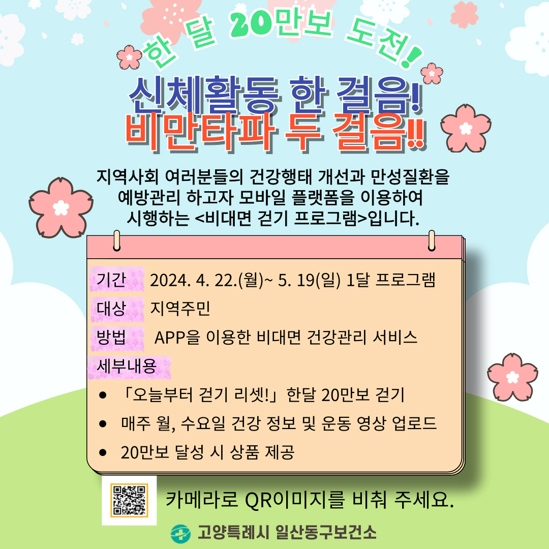 [고양신문] 일산동구보건소는 2024년 직장인 대상 비대면 걷기 프로그램인 ‘신체활동 한걸음! 비만타파 두 걸음!!’을 22일부터 진행한다.