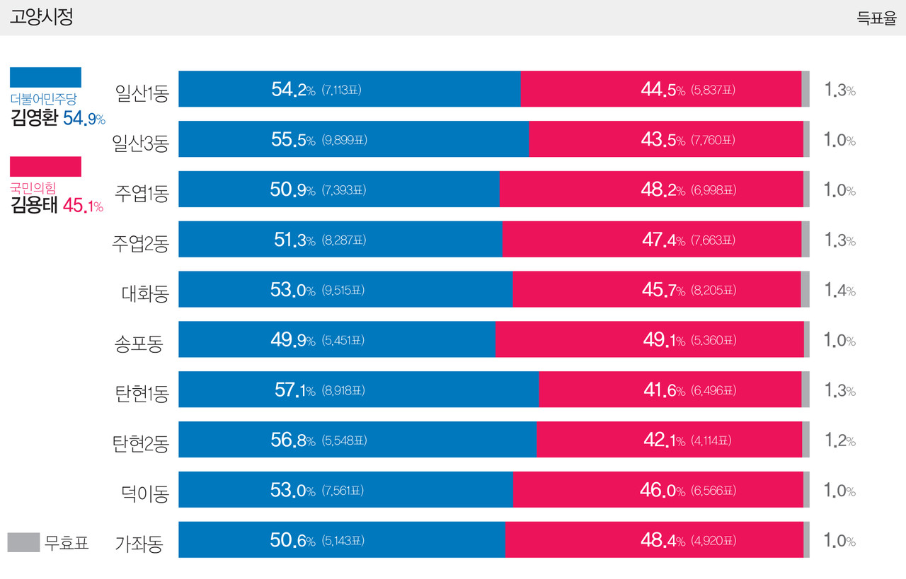 김영환 후보는 고양시정 선거구 10개 동 가운데 보수색이 강한 송포동을 포함 10개동에서 모두 승리했다. 득표율에서 적게는 2.7%p(주엽1동), 많게는 15.5%p(탄현1동) 차이로 이겼다. 전통적으로 보수층과 진보층이 비등했던 주엽1·2동에서 승리한 것이 큰 힘이 됐다. 특히 선거운동 기간 막바지 김용태 후보가 덕이데이터센터 직권 취소에 큰 힘을 보태고 있다는 보도가 전해져 불리할 것으로 예상됐던 덕이동에서도 7%p 차이로 김영환 후보가 이긴 것이 눈길을 끈다.