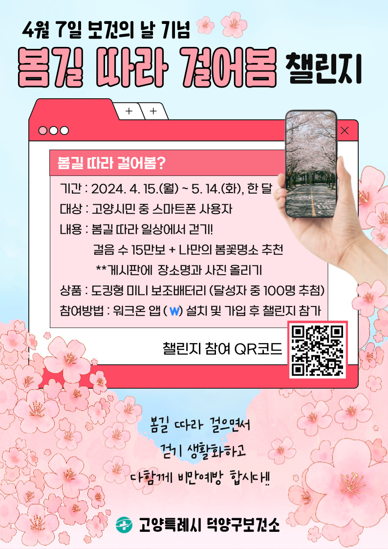 [고양신문] 덕양구보건소는 오는 15일부터 모바일 플랫폼인 워크온 앱을 이용한 ‘봄길 따라 걸어봄’챌린지를 운영한다. 이번 챌린지는 보건의 날(4월 7일)을 기념해 봄을 주제로 한다.