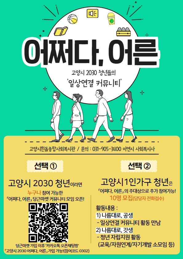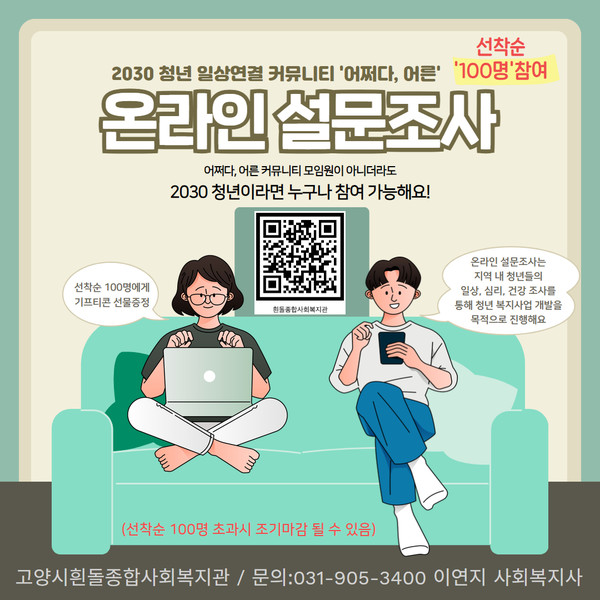 이번 조사는 4월 15일부터 4월 30일까지 고양시 거주 청년들을 대상으로 하며 ‘생활&일상, 외로움, 사회 안정감, 삶의 만족도’와 관련된 욕구 등을 파악한다. 조사결과는 청년들의 일상연결 커뮤니티를 통한 사회적 관계망 구축 프로젝트 '어쩌다, 어른' 추진을 위한 기초자료로 활용할 계획이다.