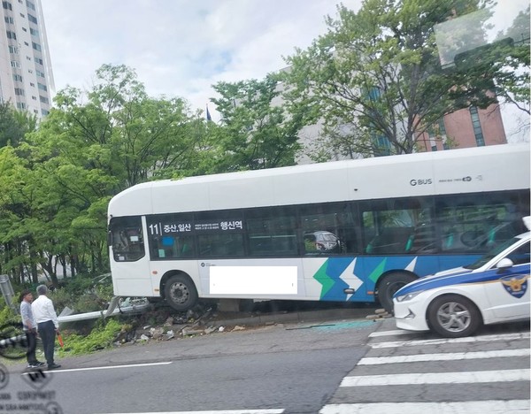[고양신문] 22일 아침 7시30분경 중앙로 백석동 이마트 사거리를 향하던 시내버스가 장항동 899로 지점에서 인도 경계석을 넘어 신호등과 가로등을 들이받는 사고가 났다.