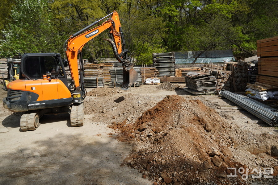 [고양신문] 18일 원당역 인근의 한 야산 기슭. 울타리로 둘러싸인 건설자재 야적장의 바닥을 긁어내자 회색의 자갈과 시멘트벽돌 조각들이 먼지와 함께 모습을 드러냈다. 제보를 한 기세남(행주기씨 문중 비상대책위원장)씨는 “바닥을 뒤덮은 정체불명의 매립물질은 건설폐기물”이라고 주장했다.