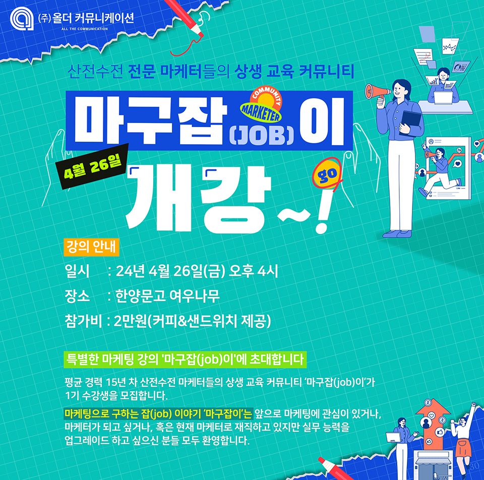 이에 착안해 개설된 '마구잡이'는 10년 차 마케팅 회사인 (주)올더커뮤니케이션의 핵심 마케터들 그리고 이 마케터들과 협업하고 있는 마케팅 셀럽들이 주축 강사로 참여해 마케팅 강의 외에 실무 소통의 지점을 강화했다.