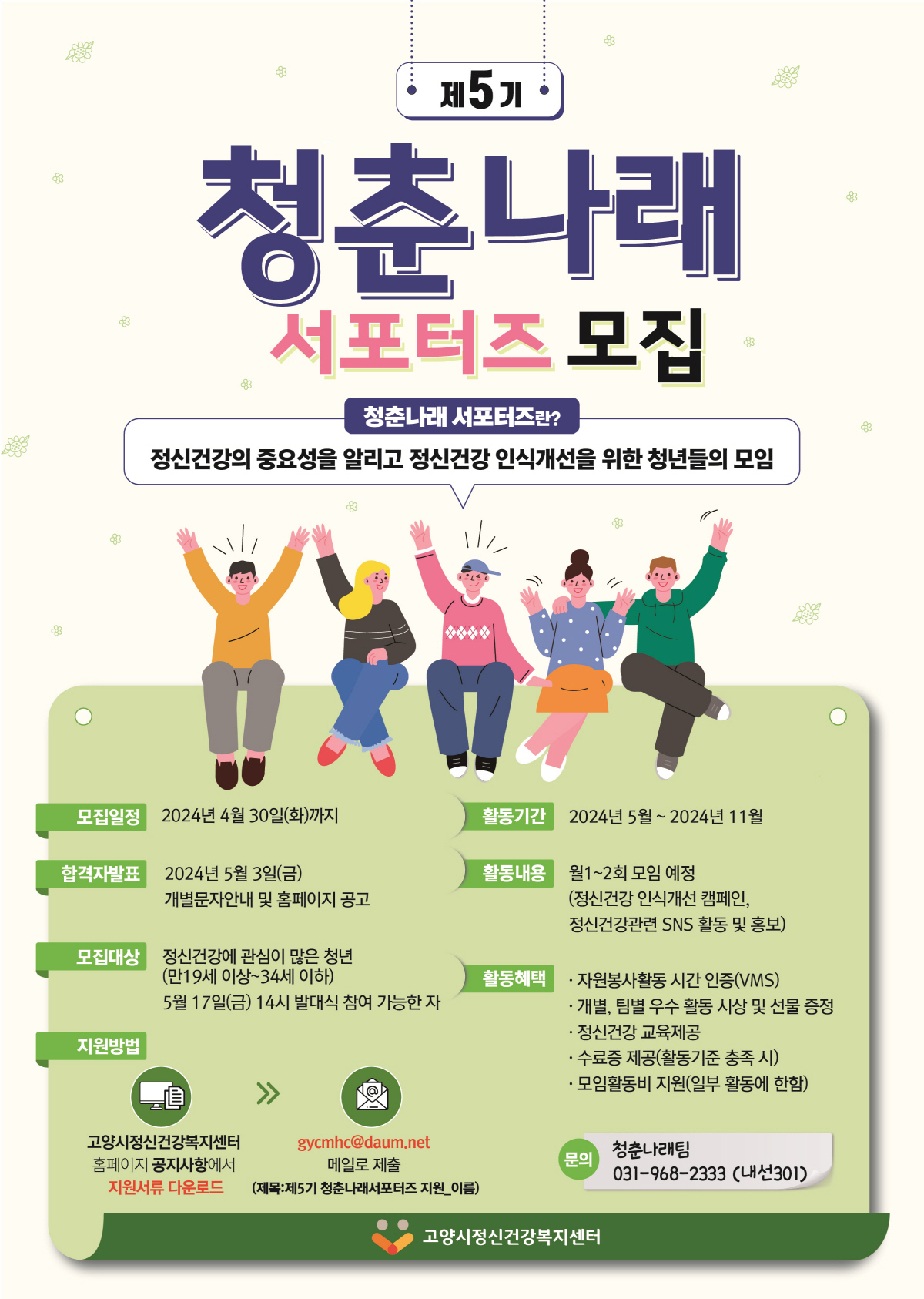 [고양신문] 고양시정신건강복지센터가 ‘제5기 청춘나래 서포터즈’에 참여할 청년들을 오는 30일까지 모집한다.