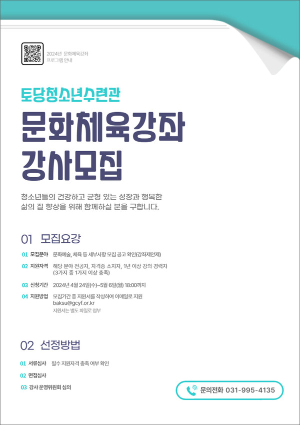 접수는 토당청소년수련관 누리집(www.gcyf.or.kr/td/)에서 응시원서를 내려받아 5월 6일까지 이메일(baksu@gcyf.or.kr)로 제출하면 된다. 서류심사를 통해 필수 자격요건 충족 여부를 확인한 후 면접 심사와 강사운영위원회 심의를 거쳐 최종적으로 선발된다.