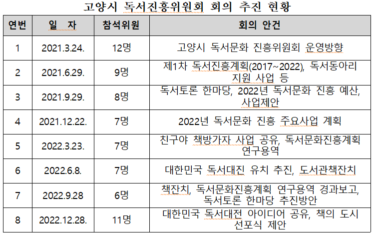 이 같은 내용은 지난 19일 신인선 시의회 문화복지위원회 위원(더불어민주당)의 시정질문을 통해 지적됐다. 신인선 의원에 따르면 민선8기 이후 고양시 도서관정책은 나아지기는커녕 오히려 퇴보하는 모습을 보이고 있다. 실제로 전국 평균의 절반 수준에 불과했던 도서관 당 사서 수(2018년 기준 2.8명, 전국 평균 4.4명)는 개선되지 않았으며 오히려 19개 시립도서관 중 14곳의 관장을 사서가 아닌 행정직렬이 맡는 등 사서중심의 도서관 정책에 역행하고 있는 것으로 드러났다. 게다가 2020년 독서문화 활성화 방안 마련을 위해 해마다 운영돼온 독서진흥위원회 또한 2022년 12월 이후 단 한 차례도 열리지 않았다.