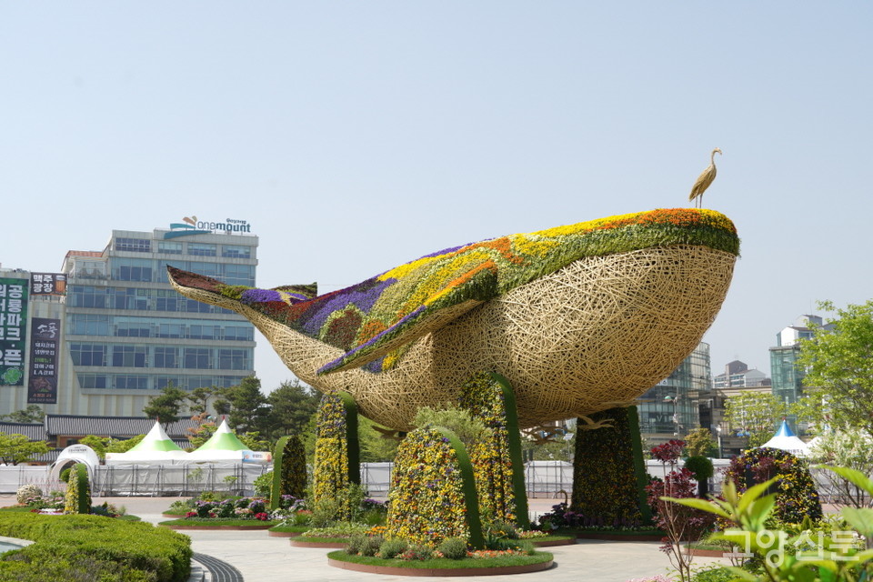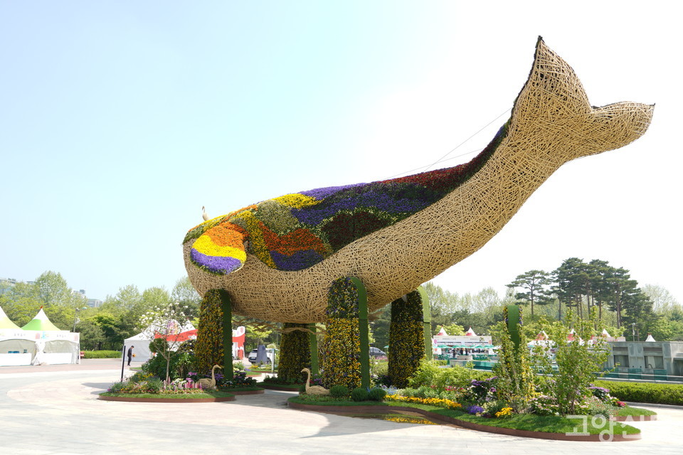 게이트1을 통과해 주제광장인 지구환경정원으로 들어서면 커다란 꽃등고래가 방문객을 반긴다. 자세히 보면 우아한 새 한 마리가 울긋불긋 꽃등고래 위에 날아와 앉았다. 장항습지의 깃대종인 재두루미다. 멸종위기종 고래와 두루미를 통해 ‘지구환경과 꽃’이라는 올해 주제를 표현했다.