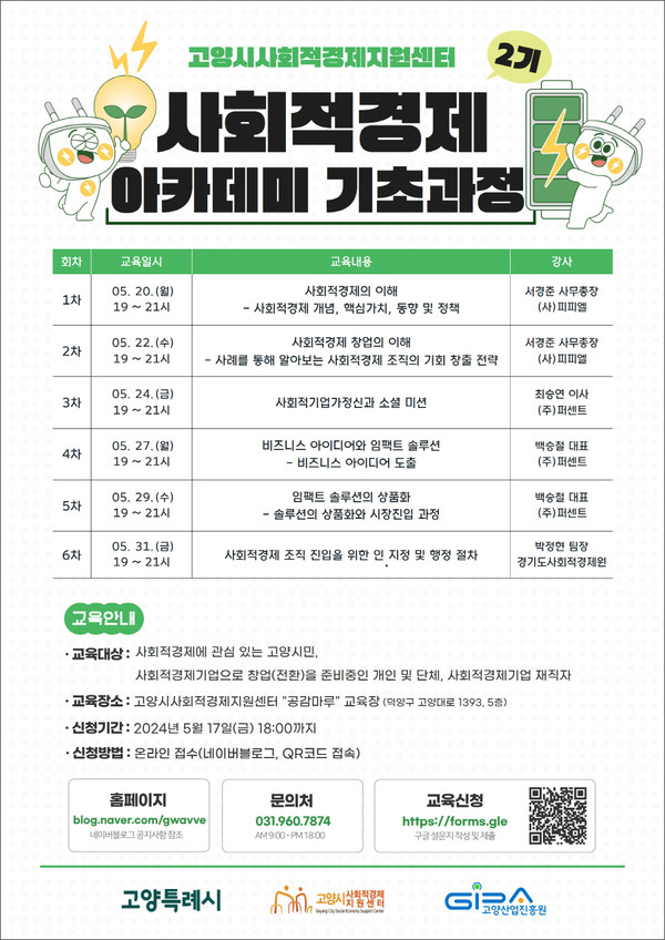 교육 참여를 원하는 경우 고양시사회적경제지원센터 블로그(blog.naver.com/gwavve)에서 사업 공고문을 확인한 후, 별도의 구글폼을 통해 신청하면 된다. 해당 교육과 관련해 궁금한 사항은 고양시사회적경제지원센터(031-960-7874)로 문의하면 된다.