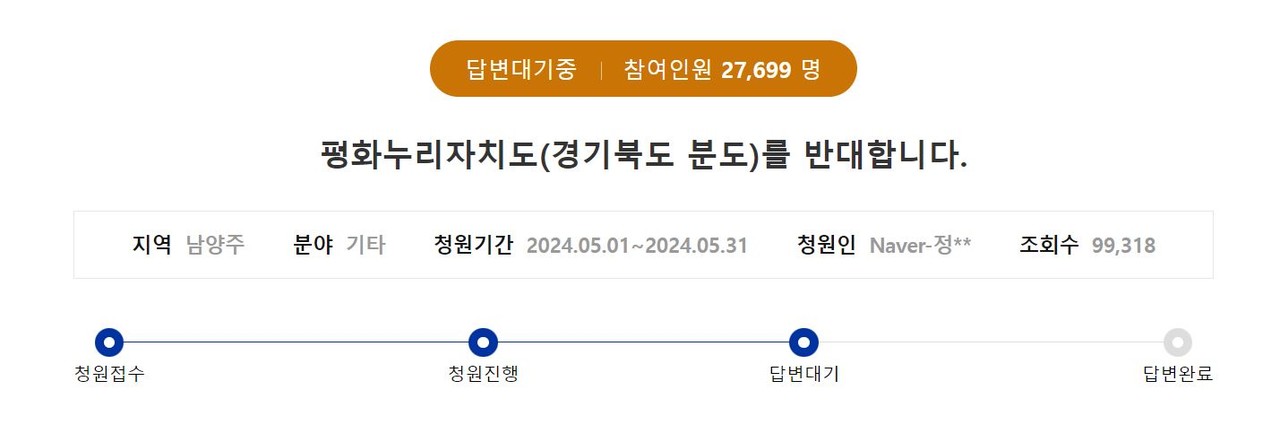 2일 오전 경기도민청원 홈페이지에 게시된 ‘평화누리자치도(경기북도 분도)를 반대합니다’라는 청원 글에 이날 오후 3시 현재 2만7699여명이 동의했다. 이 청원은 전날 올라왔고 불과 하루 만에 청원 답변 요건인 1만명 동의가 이뤄졌다. 청원 작성 후 의견수렴 기간 30일 동안 1만 명의 동의를 받으면 김동연 지사가 청원에 대해 직접 답변해야 한다. 30일 동안 기준치를 넘지 못하는 청원도 많은데, 하루도 되지 않아 이를 채운 건 이례적으로 빠른 속도라는 분석이다.