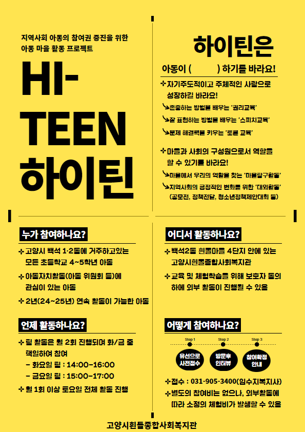 [고양신문] 고양시흰돌종합사회복지관(관장 심재경)은 아동 친화적인 지역사회 환경 조성을 위해 학교와 아동 관련 기관, 유관 단체 등과 협력해 아동의 참여권 보장을 위한 프로젝트 ‘HI-TEEN(하이틴)’을 다년간 기획하고 실천해 왔다.