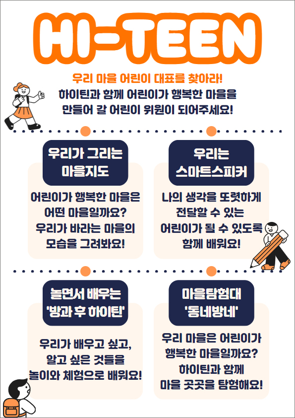 ‘HI-TEEN’의 아동 자치 활동에 관심 있는 아동을 대상으로 5월 9일까지 모집이 진행되며, 유선(031-905-3400)이나 구글폼((https://forms.gle/Q7baiBLc3cWVKjg3A)으로 문의 및 신청을 할 수 있다.