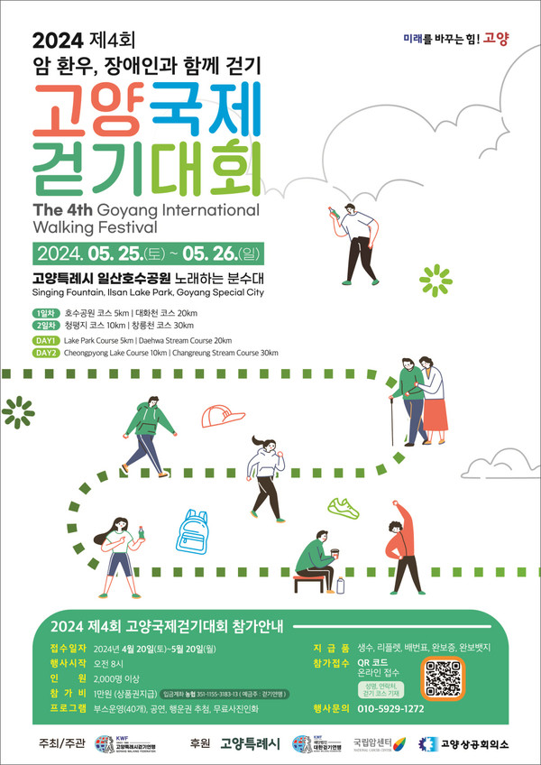 [고양신문] 2024 제4회 고양국제걷기대회가 오는 25, 26일이틀에 걸쳐 일산호수공원 노래하는 분수대에서 열린다. 고양시걷기연맹이 주최하는 행사로 △1일 차 25일엔 호수공원 코스, 대화천 코스로 △2일 차 26일엔 청평지 코스, 창릉천 코스로 진행된다.