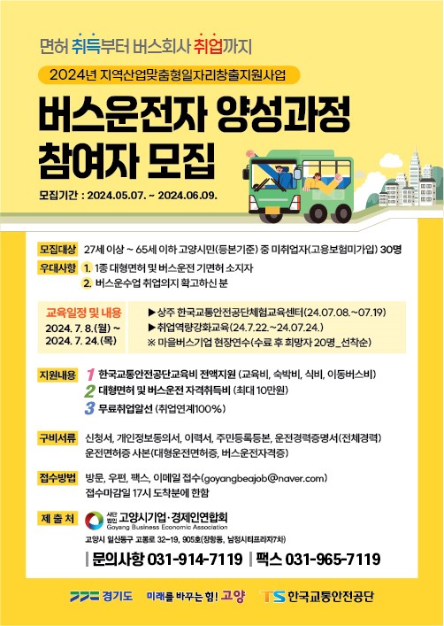 [고양신문] 고양시는 2024년 지역·산업 맞춤형 일자리창출 지원사업에 선정된 ‘고양시 버스 운전자 양성과정’ 참여자를 6월 9일까지 모집한다.