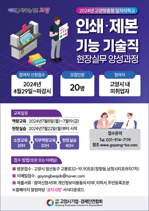 [고양신문] 고양시는 2024년 고양맞춤형 일자리학교 사업에 선정된 ‘인쇄·제본 기능기술직 현장실무 양성과정’의 참여자를 모집한다.