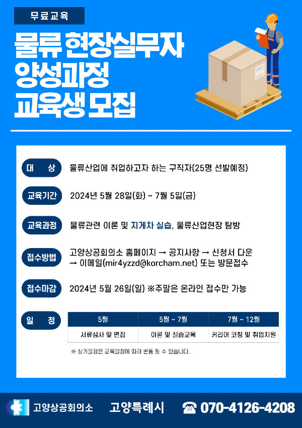 올해 교육은 이달 28일부터 7월 5일까지 이론 수업은 비대면 또는 고양상공회의소 교육장에서, 실습은 지게차 실습장, 물류 산업현장 등에서 총 161시간 동안 진행되고 수료 후에는 본격적인 취업 지원도 연계할 예정이다.