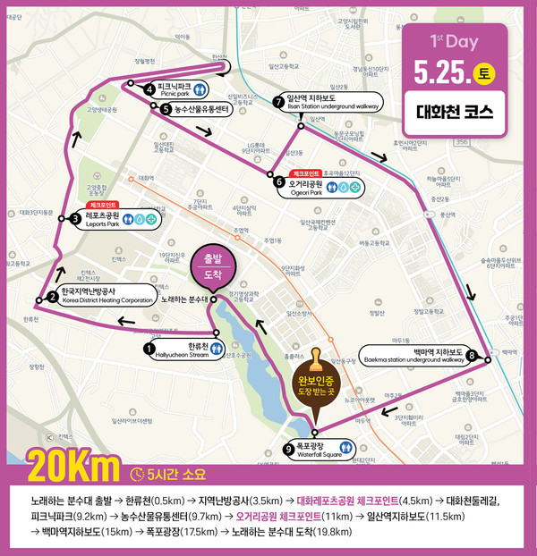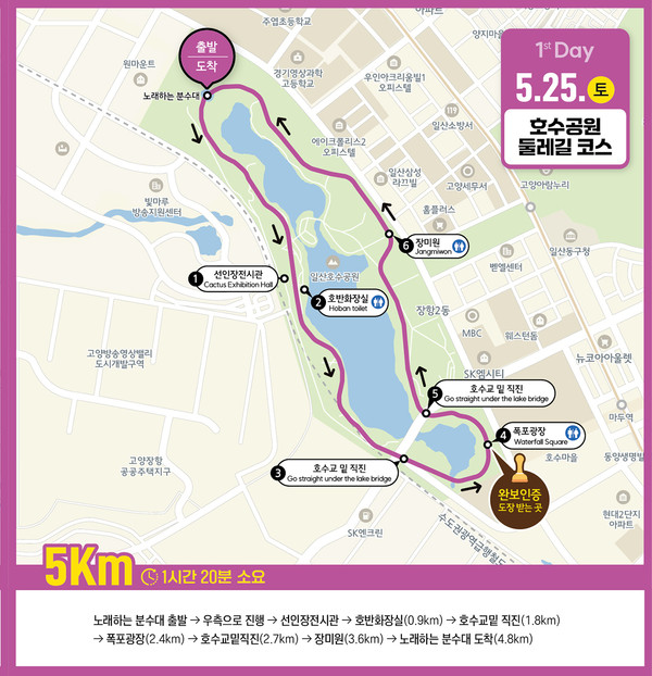 행사 첫날인 25일 진행될 제1코스 걷기는 아름다운 호수공원을 중심으로 5㎞를 걷고 호수공원을 출발해 한류천~대화천~백마역~폭포광장을 가로지르는 20㎞ 제2코스도 진행된다.