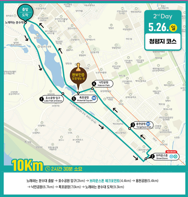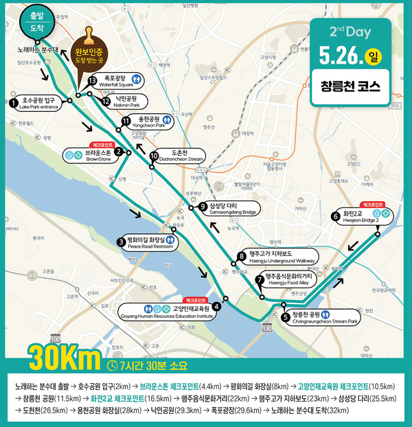 이튿날인 26일에는 제3코스로 호수공원을 출발해 낙만공원과 용천공원을 가로지르는 10㎞와 호수공원에서 평화의길~창릉천~행주음식문화거리~도촌천을 경유해 다시 호수공원으로 돌아오는 30㎞ 제4코스가 이어진다.