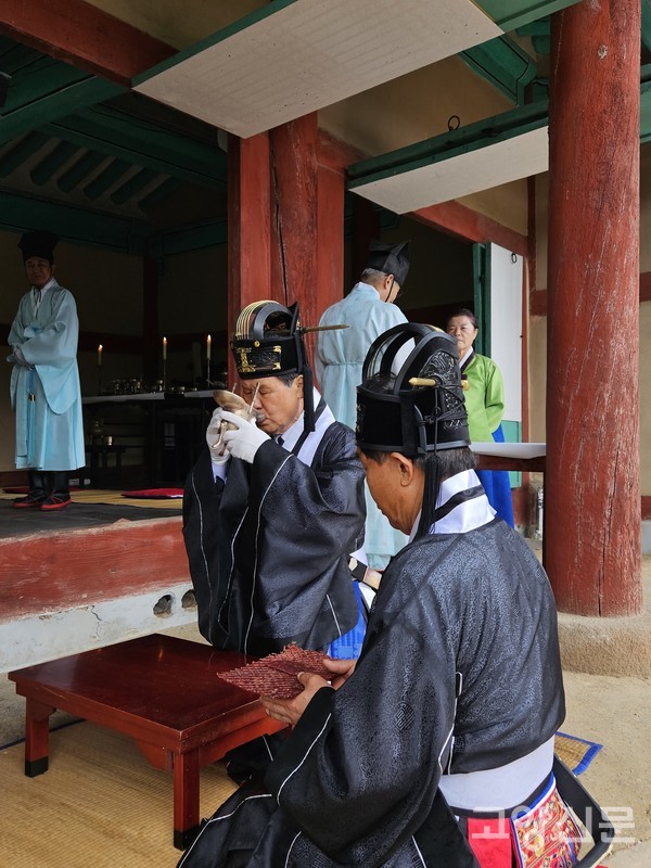 대성전에는 김용규 고양문화원장이 초헌관, 고부미 고양시의회 문화복지위원장이 아헌관, 김영명 전 농협대학교 산학협력처장이 종헌관을 맡았고, 동무와 서무 분헌관은 권정택 행주서원장과 김태일 고양동장이 맡았다. 석전을 총감독하는 역할인 감제는 이현규 성균관유도회 고양지회장이 맡았고, 축문을 읽는 대축은 이남무 봉암서예원장이, 행사 사회자 역할인 집례는 정대채 용강서원장과 정영애 전 여성유도회장이 맡아 봉행했다.