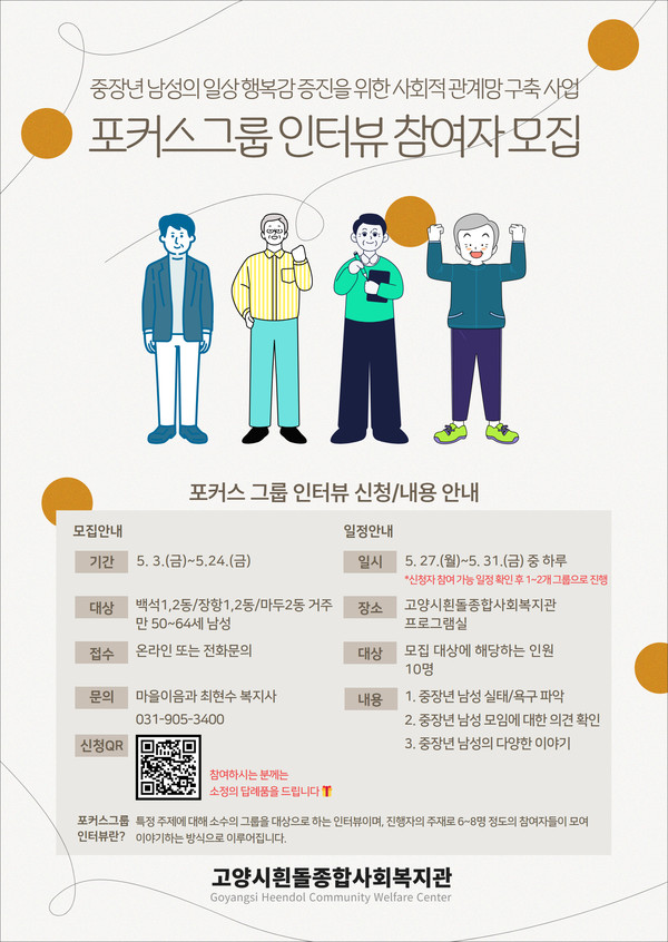 ‘중장년 남성의 일상 행복감 증진을 위한 사회적 관계망 구축 사업’을 위한 포커스그룹 인터뷰는 고양시 2권역(백석1·2동, 장항1·2동, 마두2동)에 거주하는 만 50세~64세 남성을 대상으로 5월 24일까지 모집한다. 전화(031-905-3400)나 온라인(https://forms.gle/qC3Ef3yL1ETHMFTa9)으로 문의와 신청을 할 수 있다.