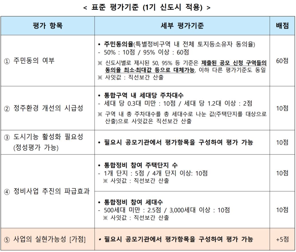 국토부에 따르면 1기 신도시에 대한 선도지구 표준 평가기준은 총 100점으로 이 중 주민동의 여부가 60점으로 가장 큰 비중을 차지한다. 여기에 주민 동의율이 50% 이상이면 60점 배점 중 10점이, 95% 이상일 경우 60점이 각각 부여된다. 다만 각 지자체는 공모 신청한 구역들의 동의율 최소값을 10점, 최대값을 60점으로 대체할 수 있다. 사실상 가중치가 가장 큰 동의율이 선도지구 선정의 관건이라고 볼 수 있다.