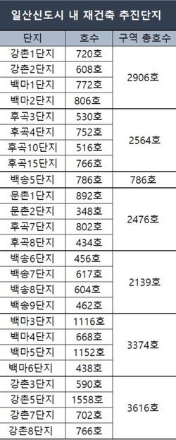 현재 일산신도시에서 활발히 재건축을 추진하는 다른 단지도 선도지구 후보선상에서 빼놓을 수 없다. 문촌1·2·후곡7·8단지(총 2476호), 백송6·7·8·9단지(총 2139호), 백마3·4·5·6단지(총 3374호), 강촌3·5·7·8단지(총 3616호)가 현재 통합재건축을 추진하고 있다. 이를 놓고 보면 일산신도시에서 선도지구 경쟁에 뛰어들 세대는 최소한 약 1만8000호다.