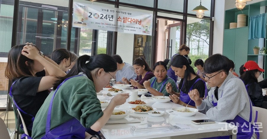 [고양신문] 땅에서 나오는 콩과 채소들은 바다에서 사는 멸치와 전혀 만날 일이 없다. 하지만 콩이 두부와 된장이 되고 된장찌개 안에서 멸치 육수와 하나가 되면서 맛있는 요리로 변신한다. 서로 다른 여러 재료가 모여 맛을 내듯 여러 나라의 문화를 가진 청년들이 소통하는 소셜다이닝 행사가 지난 24일 옛 능곡역 토당문화플랫폼 ‘키친1904’에서 열렸다. 이번 소셜다이닝 행사는 고양시지속가능발전협의회(회장 나도은)가 주최하고 중부대 국제교류원 유학생과 한국 학생들이 참여했다.