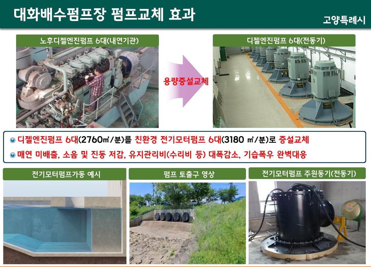 고양시는 지난 14일 일산서구청에서 대화배수펌프장 정비공사 기본 및 실시설계용역에 대한 착수보고회 및 주민설명회를 가졌다. 대화배수펌프장은 30년 전인 1994년 설치됐다. 시설 노후화로 디젤엔진펌프를 운영하면서 매연배출, 소음 및 진동발생, 잦은 고장 등 문제가 있었다. 2018년에는 집중호우로 법곳동 인근 18.6ha가 침수피해를 겪기도 했다.