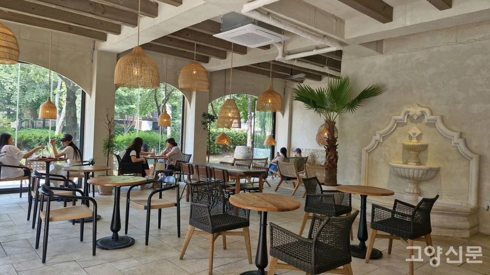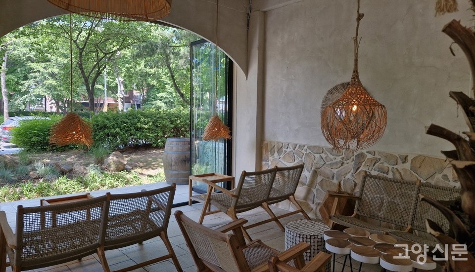 ‘코코에르’는 작은 정원과 앞마당을 갖는 스페인 파티오 양식으로 꾸며져 고양시에서도 스페인 여행 온 듯한 기분을 만끽할 수 있다. 태양이 가득한 한낮에는 시원한 물을 뿜어내는 사자 분수대에서 열기를 식힐 수 있다. 코코에르에서 인기 있는 자리는 통창을 모두 열고 불어오는 자연 바람을 맞을 수 있는 야외 벤치 좌석이다. 유럽의 정원에서 등을 편하게 뉘고 쉬는 듯한 호사로운 기분을 느낄 수 있다.
