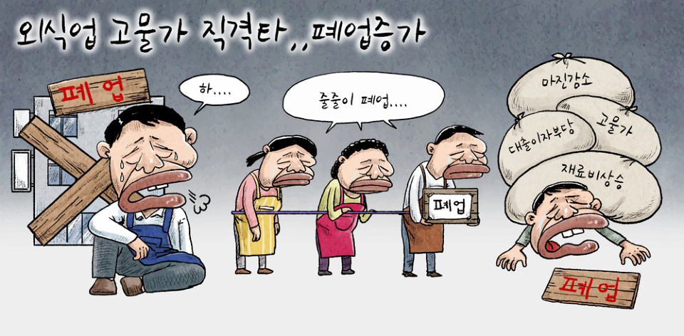 통화량은 어떤가. 올 1~2월에만 120조 원이 풀렸음에도 물가상승을 주도하는 것은 개인과 자영업자가 아니라 환율상승을 방치한 한국은행과 정부다. 전기요금 3.6%, 도시가스요금 5.6%, 지역난방 12.1%, 상수도비 2.1% 등 각종 공공요금이 오르면서 그 부담은 고스란히 개인과 자영업자에게 전가됐다. 물가안정은 중앙은행과 정부 정책, 기업 희생과 가계협력 순으로 해결해야 하는데, 오로지 가계소득(임금과 소비축소) 인하로 물가를 잡겠다는 정부의 경제정책은 야만적 행위라 하지 않을 수 없다.