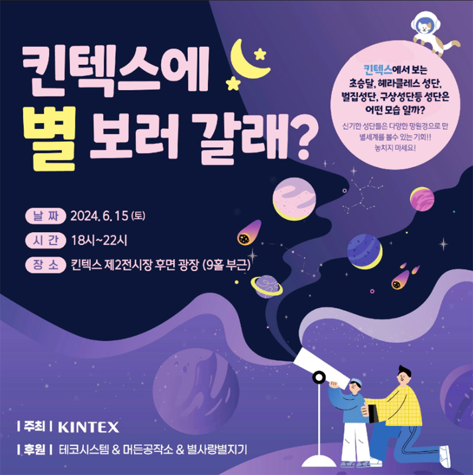 한편, 킨텍스는 별 관측 행사와 함께 14일과 15일에 걸쳐 ‘2024 킨텍스 야시장 킨(KIN)밤 지새우고’를 운영해 방문객들에게 별 관측 외에도 다양한 공연과 풍성한 먹거리, 즐길거리를 제공할 예정이다. 이날 방문객들의 편의를 위해 제2전시장 주차장은 저녁 7시부터 무료로 개방한다.