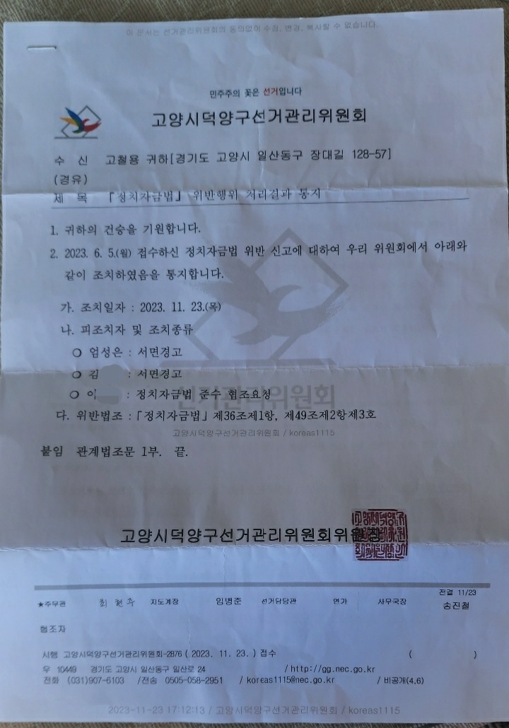덕양구 선관위 관계자는 “혐의에 대한 사실관계는 추후 수사를 통해 다툴 사안이어서 언급하기 적절치 않은 것 같다”며 “다만 고발인이 신고한 내용에 대해 조사한 결과 법 위반사항이 확인됐고 이에 따라 결과조치를 통보한 것”이라고 답변했다.