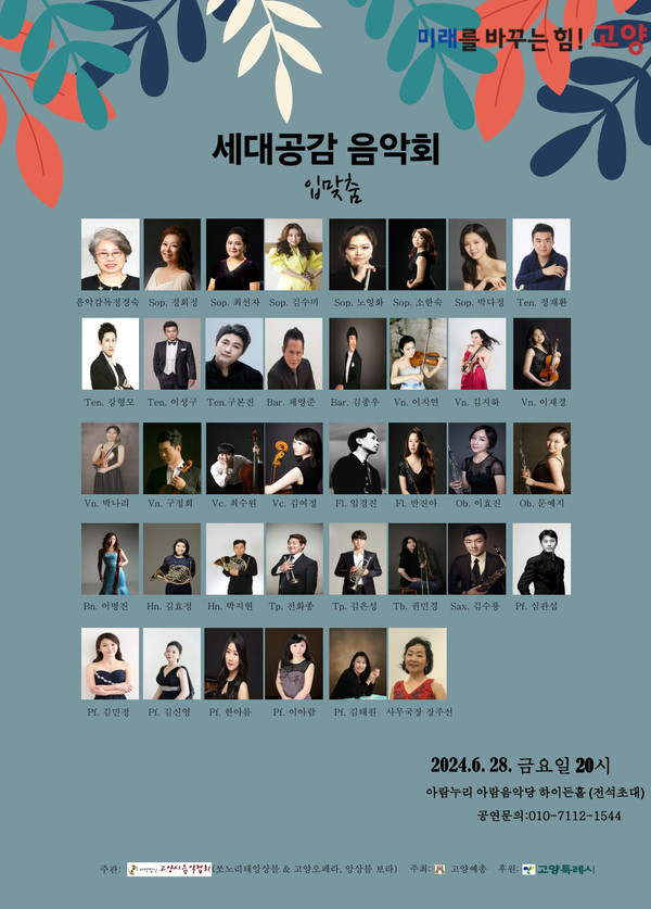 [고양신문] 고양시음악협회가 주관하고 고양예총이 주최하는 세대공감 음악회가 ‘입맞춤’이라는 주제로 오는 28일 오후 8시 열린다. 일산동구 아람누리 아람음악당에서 열리는 이번 음악회에는 소프라노 정희정과 테너 정재환, 바리톤 최영준, 바이올린 이지연, 플루트 임경진, 오보에 이효진, 호른 김효정, 첼로 최수원, 트럼펫 전화종, 색소폰 김수룡, 피아노 심관섭 등 36명의 연주자가 참여해 6월의 마지막 금요일 밤을 잔잔한 음악으로 수놓는다. 공연관람은 무료다.