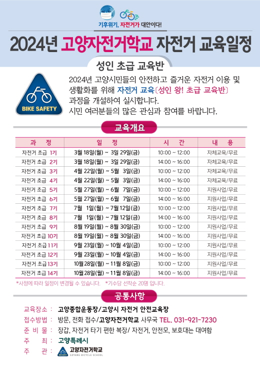 [고양신문] 고양자전거학교(대표 한기식)가 진행하는 자전거교육이 올해도 진행된다. 고양시 지원사업인 ‘시민을 위한 자전거 초급교육’은 초보자를 대상으로 실시되는 교육으로 고양시에서 15년 동안 지속적으로 이어진 장수 프로그램이다. 시민들에게 자전거를 통해서 건강과 활력을 주고 있고, 기후위기와 탄소중립이 필요한 시기에 자전거의 역할을 주도적으로 실천하고 있어 매년 참가자들에게 큰 호응을 얻고 있다.
